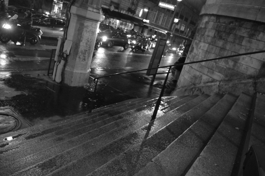 Un samedi soir d’octobre bien fade humainement parlant, seule les flaques polarisant le peu de lumière créaient un petite ambiance.